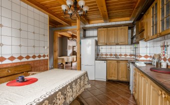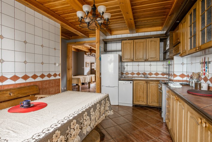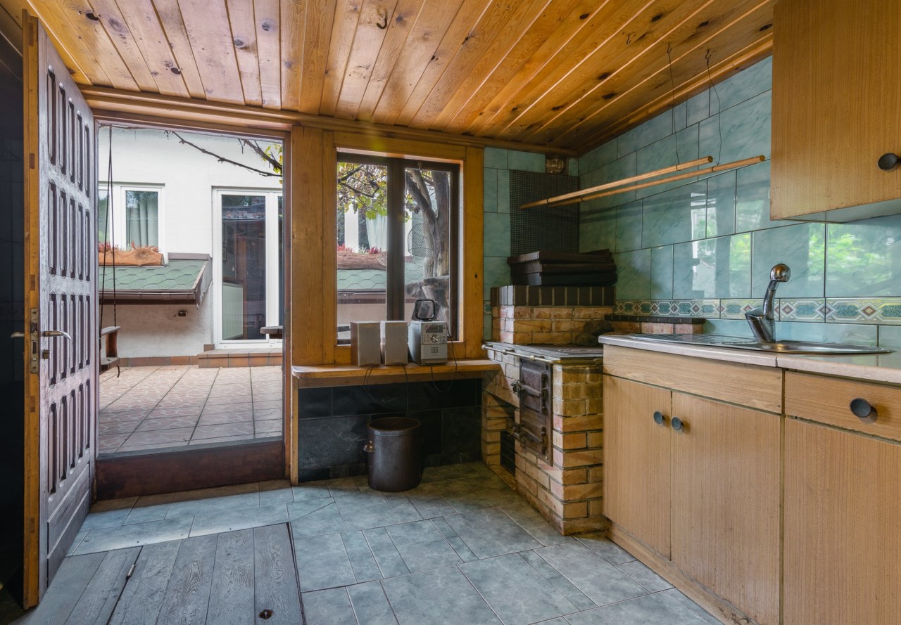 Kuchnia z wyjściem do ogrodu – na podłodze terakota, zabudowa meblami z AGD (widok w kierunku północno-zachodnim).