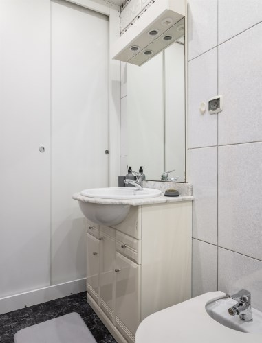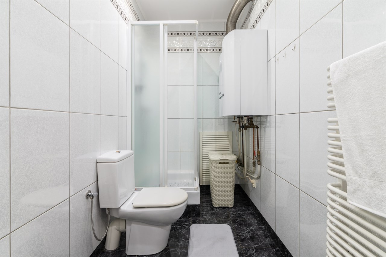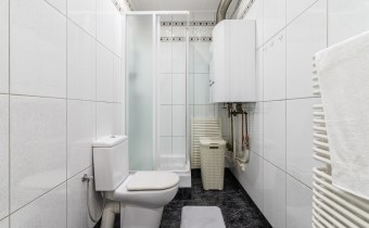 Łazienka z kabiną prysznicową, szafkoumywalką, wc, bidetem, szafą – terakota, glazura.