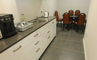 Biuro składa się z: pokoju recepcyjno-biurowego, pokoju biurowego ze stołem konferencyjnym, przestronnego gabinetu z wyjściem na taras oraz części socjalnej (aneks kuchenny połączony z jadalnią).