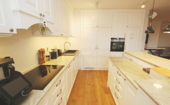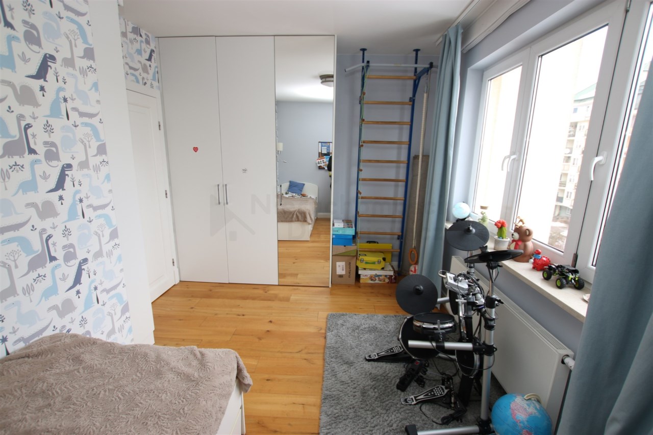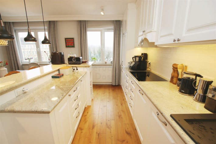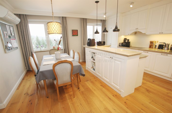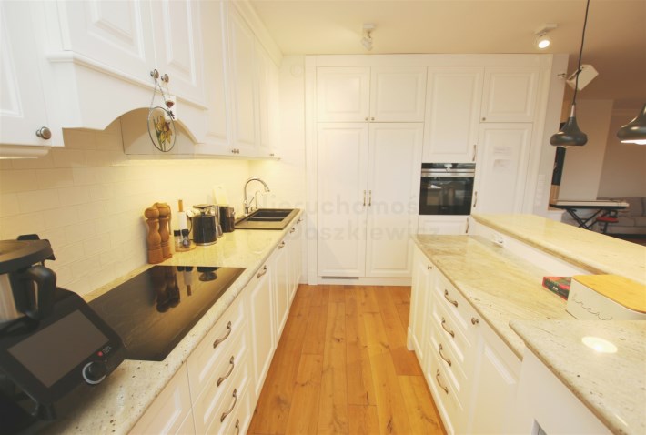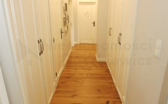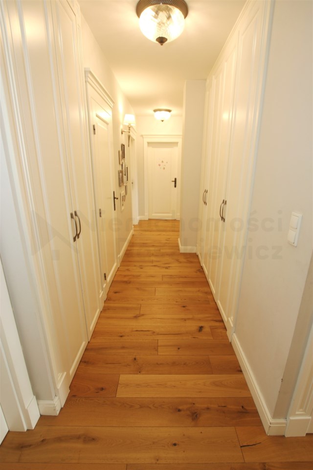 W przeważającej części mieszkania na podłodze położone są bardzo ładne deski drewniane. W łazienkach mamy wysokiej jakości gres/terakotę i glazurę oraz armaturę i sanitariaty, w holu przy wejściu do mieszkania gres. W całym mieszkaniu zostały wykonane przez stolarza stałe zabudowy pod wymiar: meble kuchenne z wyspą (wraz z kompletnym sprzętem AGD w zabudowie), szafy wnękowe w sypialniach, zabudowane pojemne szafy w holu, meble łazienkowe, itp. Dodatkowo w całym mieszkaniu zamontowane są wysokiej jakości drzwi wewnętrzne.