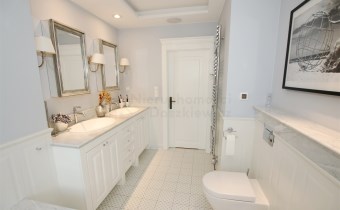2 z wanną, prysznicem, podwójną umywalką, bidetem i toaletą oraz przestronny hol zabudowany pojemnymi szafami.
