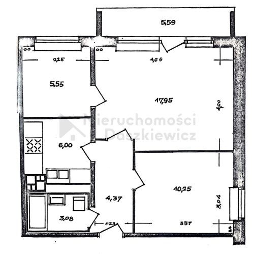 ROZKŁAD MIESZKANIA Pokój 17.95m - na podłodze panele, wyjście na balkon 5.59m (okna od strony południowo-zachodniej). Pokój 10.25m - na podłodze panele (okna od strony północno-zachodniej). Pokój 5.55m - na podłodze panele (okna od strony południowo-zachodniej). Oddzielna kuchnia 6m - na podłodze terakota, zabudowa szafkami kuchennymi z AGD: płyta gazowa, lodówko-zamrażalka, okap i pralka. Łazienka 3.08m - gres, glazura, kabina prysznicowa, szafkoumywalka i wc. W przedpokoju na podłodze panele.