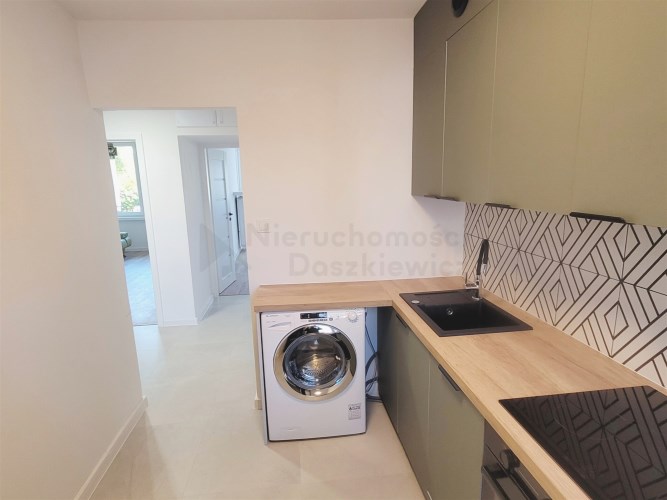 Oddzielna kuchnia 7.5m - na podłodze gres, nowa zabudowa pod wymiar z AGD: płyta indukcyjna, piekarnik elektryczny, lodówko-zamrażalka, okap, zmywarka i pralka (okna od strony wschodniej).