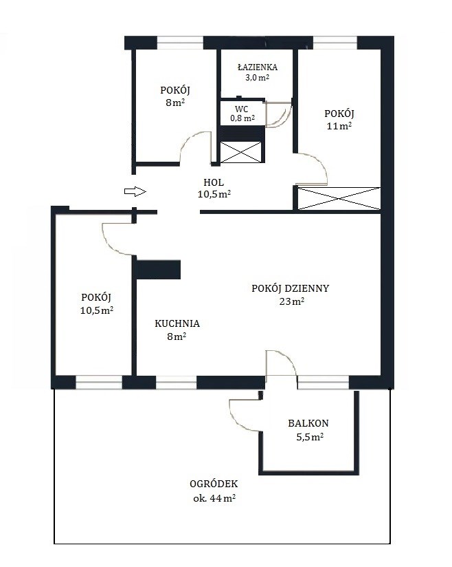Dodatkowo możliwe jest uzyskanie od Spółdzielni zgody na użytkowanie drugiego ogródka od strony sypialni (kiedyś był on już użytkowany przez właściciela mieszkania).