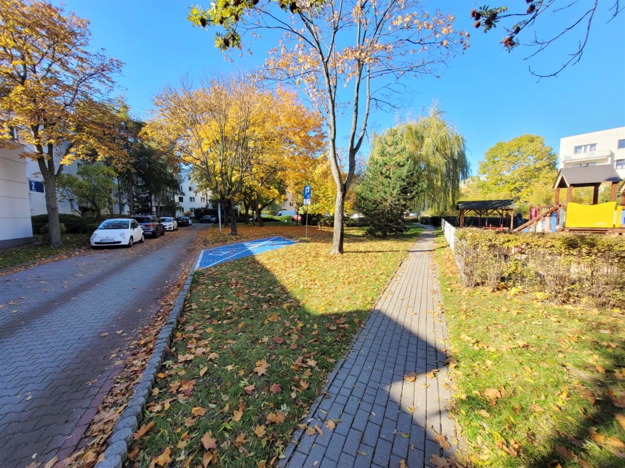Cicha i spokojna okolica, dużo zieleni, nie ma szlabanów i bram, da się spokojnie zaparkować samochód.