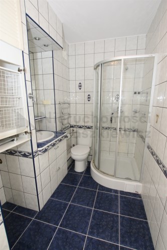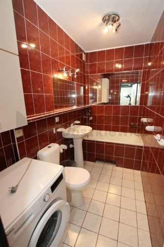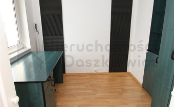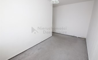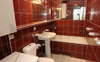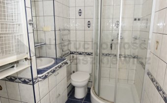 Pokój 14.7m z sypialnią 5.4m - na podłodze panele podłogowe (wystawa okien w kierunku zachodnim). Z pokoju wejście do łazienki 4.1m – terakota, glazura, kabina prysznicowa, umywalka, wc, szafka łazienkowa wisząca i miejsce na pralkę.