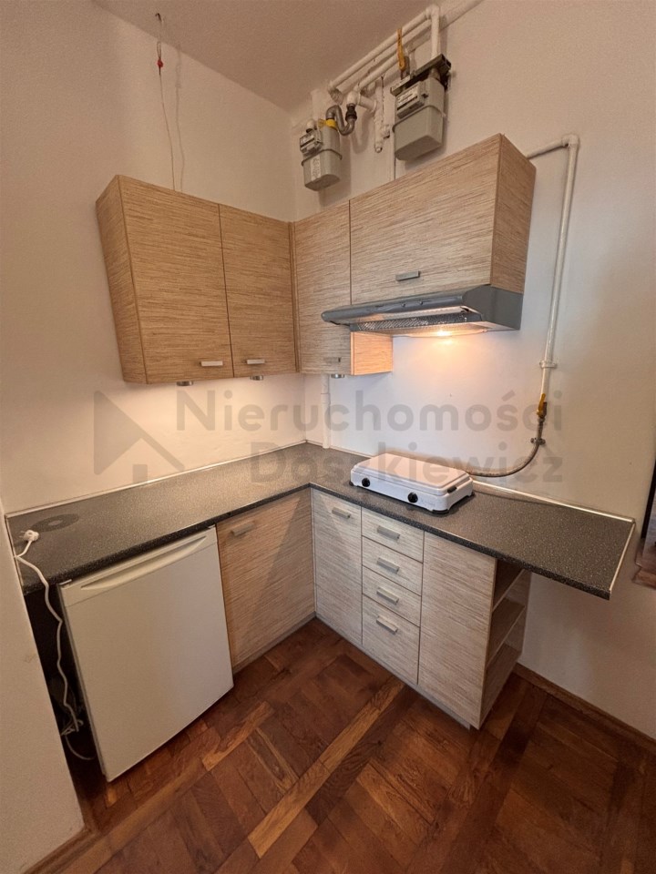 Pokój dzienny o pow. 12.5m – na podłodze parkiet (wystawa okien w kierunku północno-zachodnim). Kuchnia o pow. 6m - na podłodze parkiet, szafki kuchenne ze sprzętem AGD: lodówka, kuchenka gazowa i okap. Łazienka o pow. 3.4m – glazura, terakota, kabina prysznicowa, umywalka, pralka, wc.