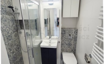 Łazienka została wykończona nową glazurą i terakotą, wyposażona jest w umywalkę z szafką + lustro z oświetleniem, wygodną kabinę prysznicową, wc oraz szafkę wiszącą.