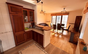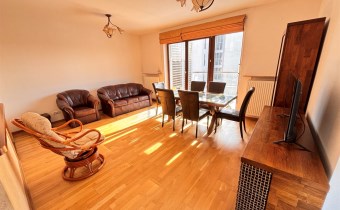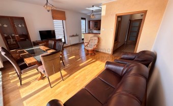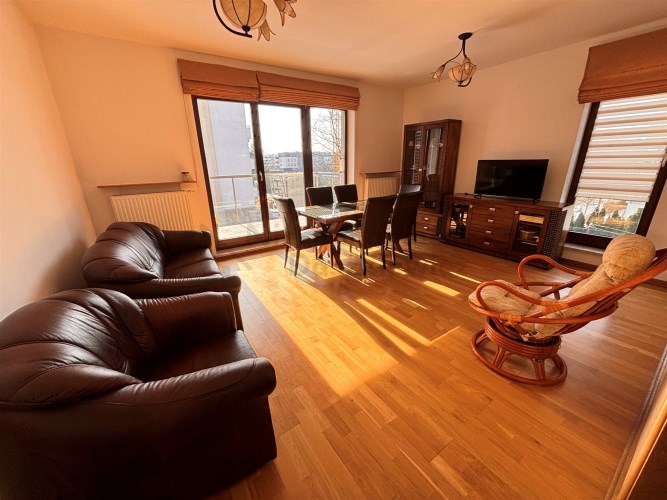 Pokój dzienny o pow. 21.5m otwarty na kuchnię 9m – na podłodze panele drewniane, na wyposażeniu skórzana sofa i fotel, fotel wiklinowy, stół z krzesłami, witryna i komoda z TV (wystawa okien w kierunku południowym i zachodnim). Z pokoju wyjście na słoneczny balkon o pow. 6.5m.