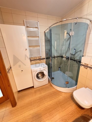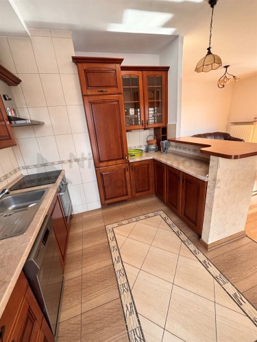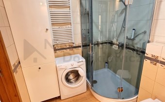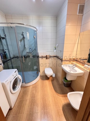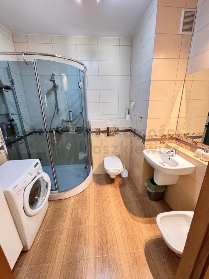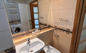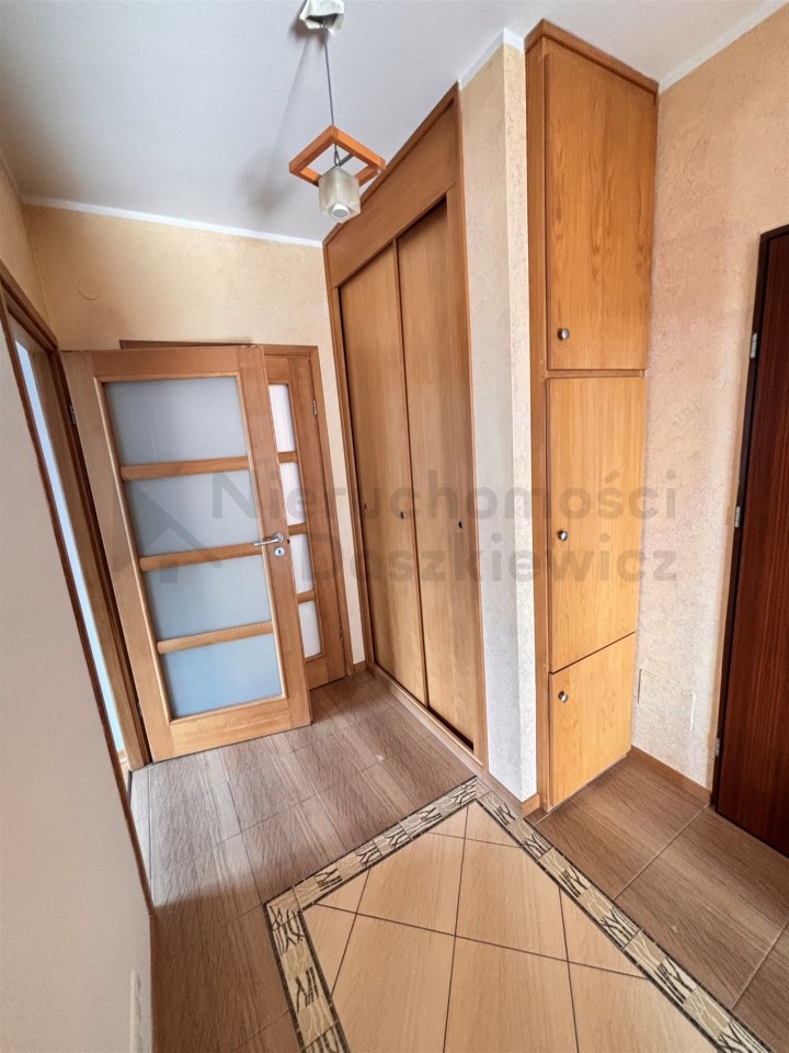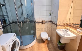 Aneks kuchenny - na podłodze terakota, na ścianie glazura w pasie technologicznym, meble kuchenne w zabudowie pod wymiar wraz ze sprzętem AGD: lodówko-zamrażalka, piekarnik elektryczny, płyta ceramiczna, okap i zmywarka (wystawa okien w kierunku zachodnim). Pokój o pow. 11m – na podłodze panele drewniane, na wyposażeniu łóżko i duża szafa (wystawa okien w kierunku zachodnim). Łazienka o pow. 5.2m – terakota, glazura, kabina prysznicowa, umywalka, wc, bidet, duża szafa łazienkowa i pralka.