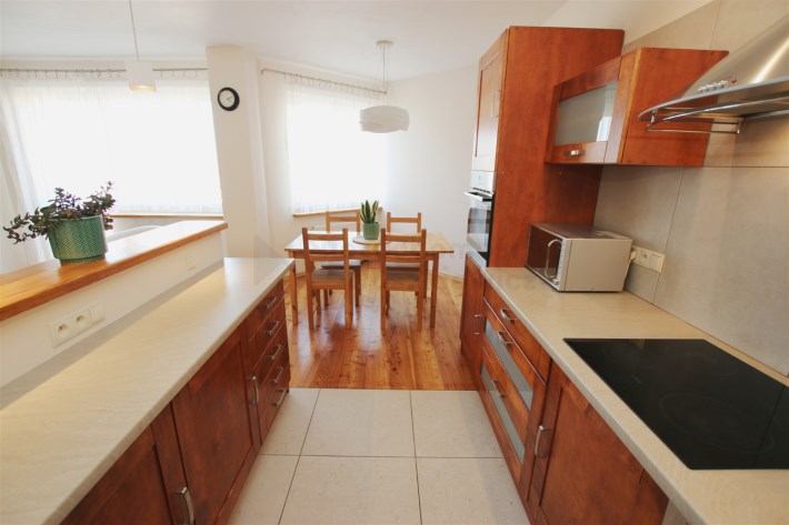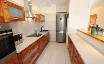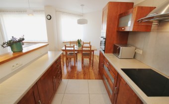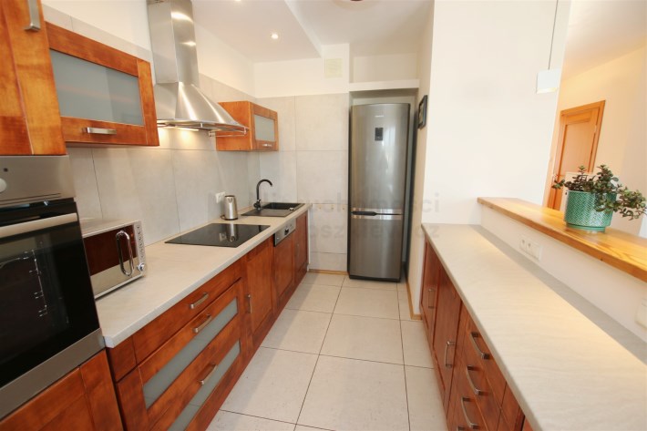 W części kuchennej na podłodze ułożony jest praktyczny gres. Kuchnia jest kompletnie umeblowana i wyposażona w sprzęt AGD (lodówko-zamrażarka, zmywarka, piekarnik, płyta ceramiczna, okap, kuchenka mikrofalowa, czajnik elektryczny).