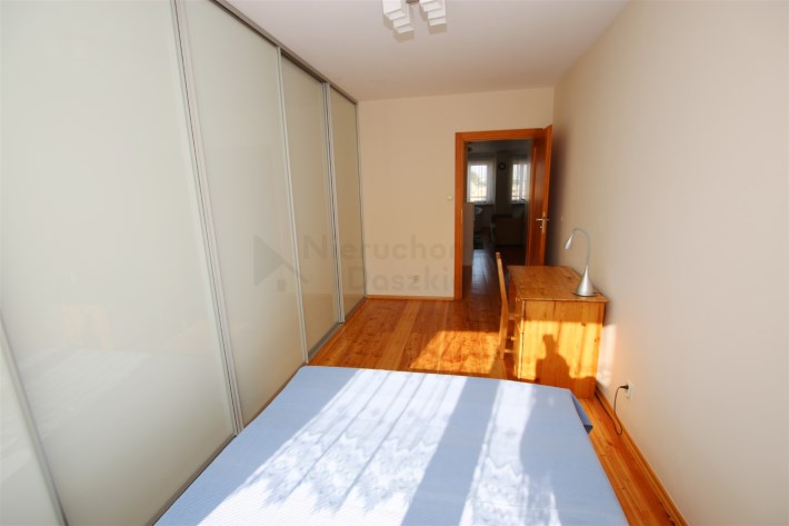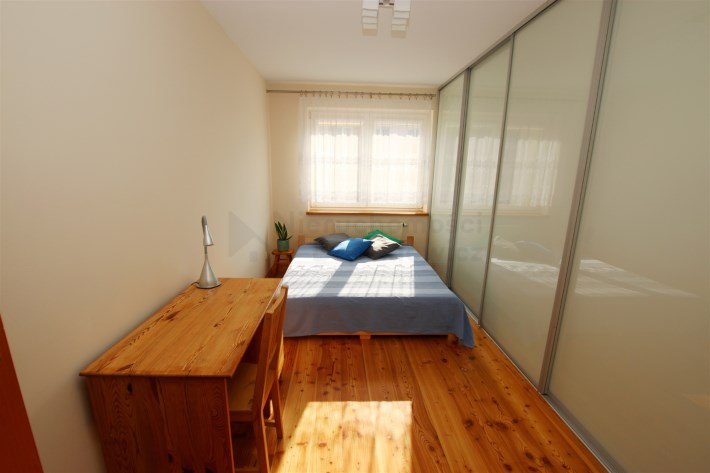W dużej sypialni o powierzchni ponad 15m2 na podłodze położona jest deska drewniana, dodatkowo na całej szerokości pokoju zabudowana jest bardzo pojemna szafa wnękowa. Na wyposażeniu znajduje się biurko z krzesłem oraz łóżko małżeńskie z materacem.